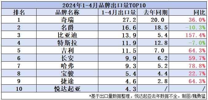具体来看,奇瑞以27.2万辆的成绩遥遥领先,名爵16.6万辆紧随其后。出口一直是奇瑞的优势,去年全年整个奇瑞集团出口汽车93.71万辆,约占总销量的一半。除了奇瑞品牌,今年前四个月,奇瑞旗下的捷途品牌也位列出口量前十。