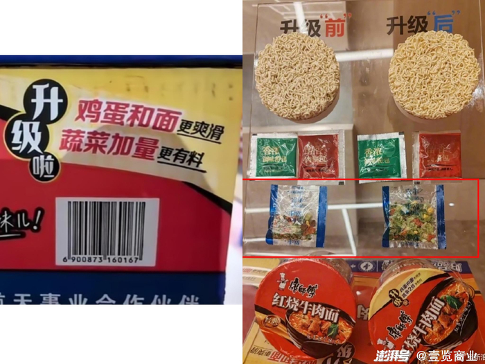 从目前的流传的图片来看,新配送的康师傅产品已换上了新包装,上面印有“鸡蛋和面更爽滑,蔬菜加量更有料”等醒目的升级标语。升级后的面饼似乎变得更大,蔬菜料包更多,包装规格更大。