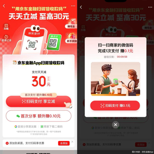 对应扫码页面上方,也出现了“扫微信收款码,支付天天减”的提示字样,点击提示便可进入活动页面。北京商报记者从京东支付方面了解到,用户在京东金融App搜索“扫码支付优惠”也可以进入活动页面,通过活动页面的扫码功能可扫码付款。两种方式均可参与支付减免活动,最高立减30元。同时,用户开展添加桌面、完成支付、分享好友等操作,也可以领到现金补贴,最高可达到288元。