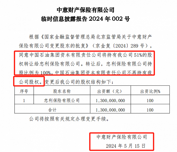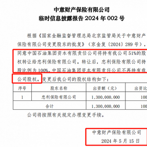 在此次股权转让之前,中油资本间接持股51%,忠利保险持股49%。