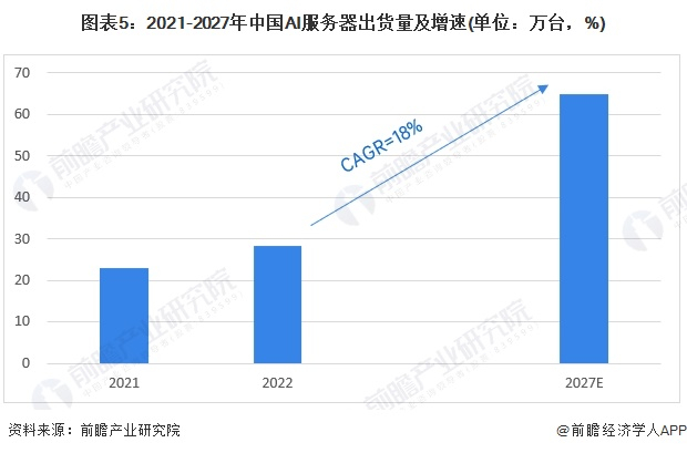 随着人工智能技术的不断进步,模型规模也在不断扩大。目前,主流的自然语言处理模型规模已从原来的几百万参数扩大到数十亿参数的大模型。这些大模型在训练过程中对计算资源的需求较大。同时,随着AI技术在各行业的广泛应用,对模型在线推理的需求也在急速增长。预计到2027年,这一需求将达到65万台,2022-2027年的年均复合增长率约为18%。