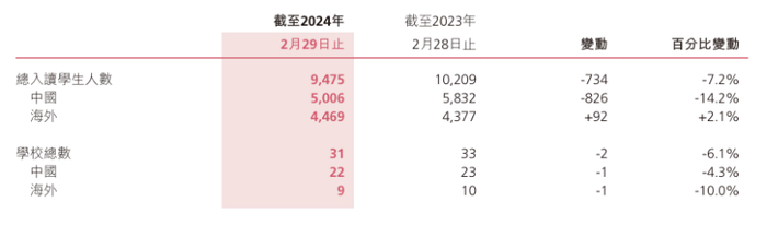 据财报披露,上半财年枫叶教育的在校学生人数同比减少7.2%,而其中,海外学生人数增加,中国学生人数减少。学校数量上,于2023/2024学年末,中国平湖的一所幼儿园已停止经营,而新加坡的一所小学校区丹戎加东校区因租赁协议于2023年8月届满而归还予新加坡政府。