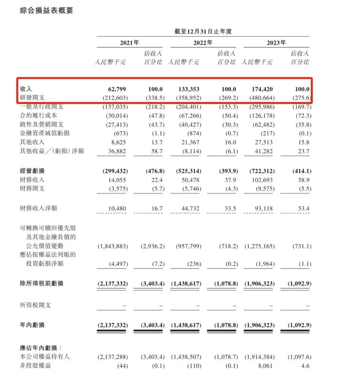 2021年、2022年及2023年,晶泰科技的收入为6279.9万元、1.33亿元及1.74亿元,年内亏损高达21.37亿元、14.39亿元及19.06亿元。