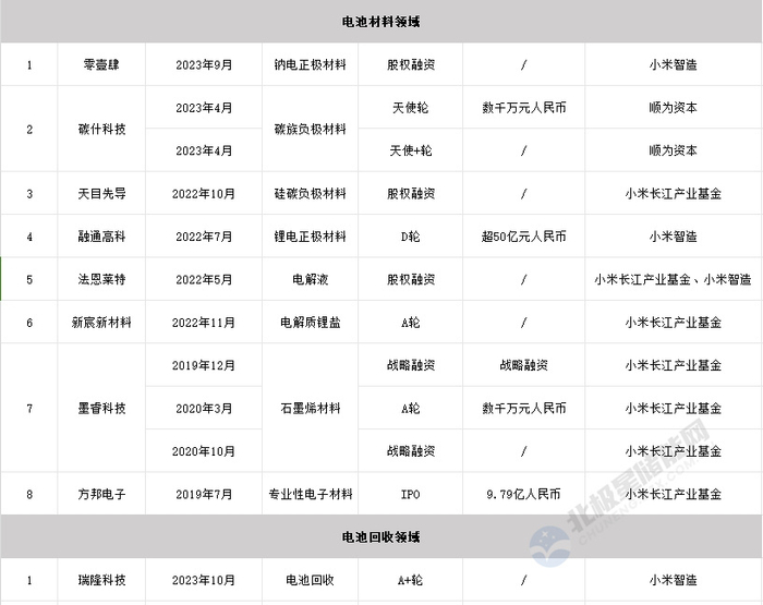 在材料端,小米投资了零壹肆、碳什科技、法恩莱特等企业,涵盖正极材料、负极材料、电解液等整个电池材料产业链。