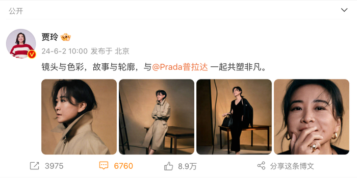 同时,@贾玲 发文表示,镜头与色彩,故事与轮廓,与@Prada普拉达 一起共塑非凡。