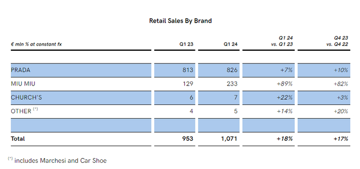 根据财报,Prada在2023年的销售收入同比增长12%至34.88亿欧元,而在2022年则同比增长25%至32.52亿欧元。