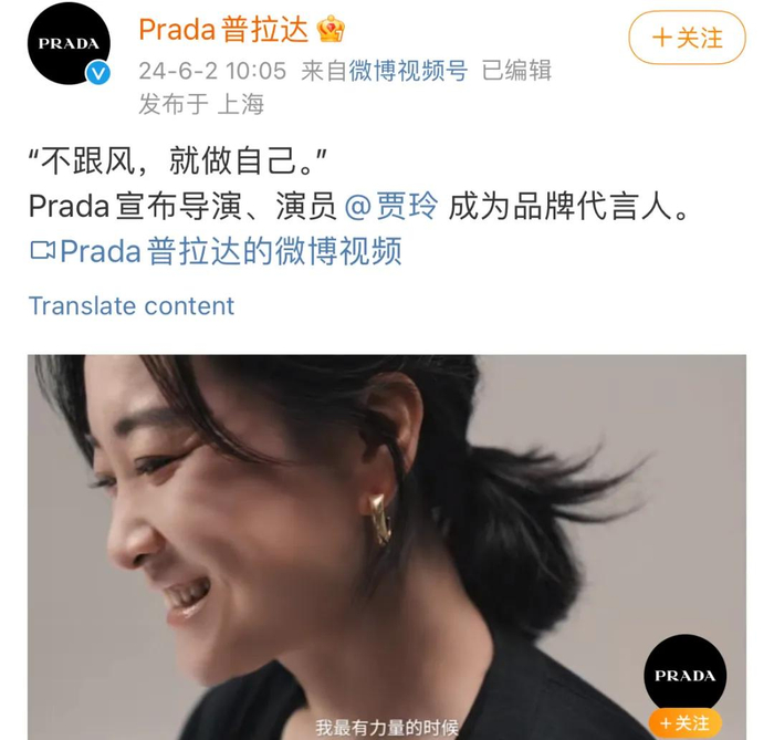 6月2日,意大利奢侈品牌Prada官宣贾玲为代言人,并称其是“中国国民度最高的演员之一”。在由摄影师王子千拍摄的宣传视频中,贾玲提到了她对影视创作和时装的态度,核心口号是“不跟风,就做自己”。