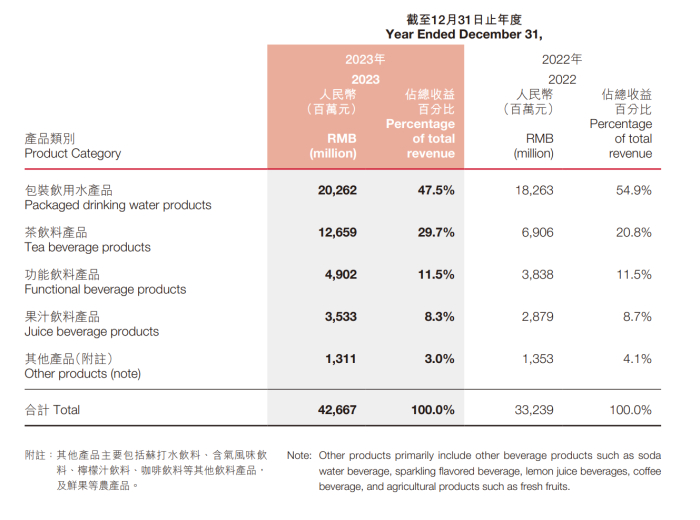 根据农夫山泉的年报,在其核心支柱包装饮用水之外,茶饮料产品已然成为动力强劲的“第二增长曲线”——2023年茶饮料营收突破百亿元达到126.59亿元,同比狂涨83.3%,占总收入的比例达到29.7%。