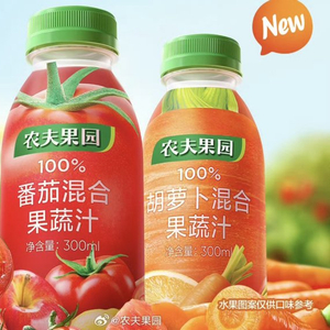 农夫果园同时上新的还有100%胡萝卜混合果蔬汁。从它官方发布的消息来看,现阶段该新产品主要在线上渠道布局。目前促销后单瓶300ml装的价格平均在6元左右。