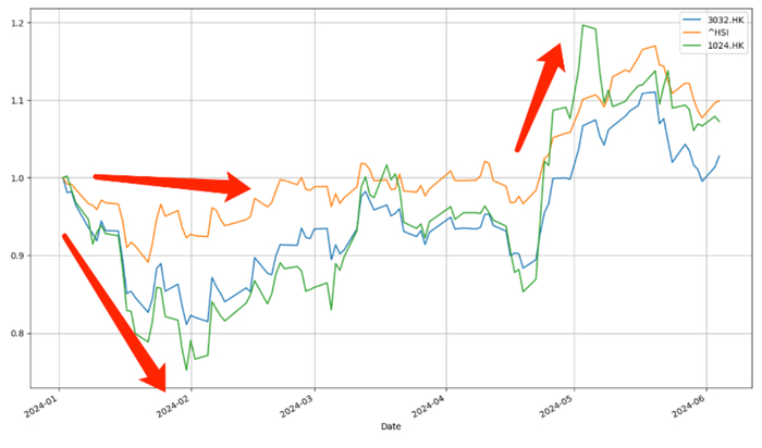 在4月下旬之后,港股迎来了一次“小阳春”,三条折线纷纷上扬,此时快手的反弹力度最大,恒生科技指数表现次之。