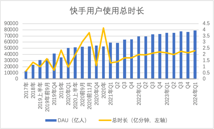 我们根据DAU,单个DAU使用市场测算快手单季度总用户时长,2024年Q1该数字接近4.6万亿分钟,上年同期该数字则为4.3万亿分钟。简单来说,快手的总流量仍处于膨胀期中,对于商家来说在一个成长性的商业环境中获得营收增长的概率,是要大于在放缓甚至停滞的生态中的。符合当前去库存保现金流的经营主节奏。