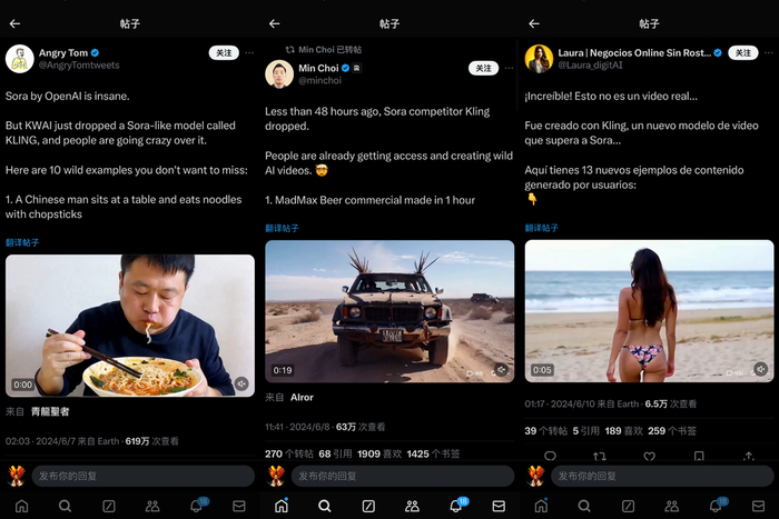 6月6日,快手发布了AI视频生成模型“可灵”,视频生成时长直接赶超Sora达到了120秒,且已在快影App中对创作者开放邀测。过去几天中,一些自称获得测试资格的博主po出了他们使用“可灵”直出的AI视频,一直不太高调的快手AI在海内外社交媒体迅速出圈。