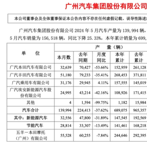 今年1月至5月,广汽集团累计销量699529辆,同比下降24.51%,整体销量比去年同期减少了22.7万辆。