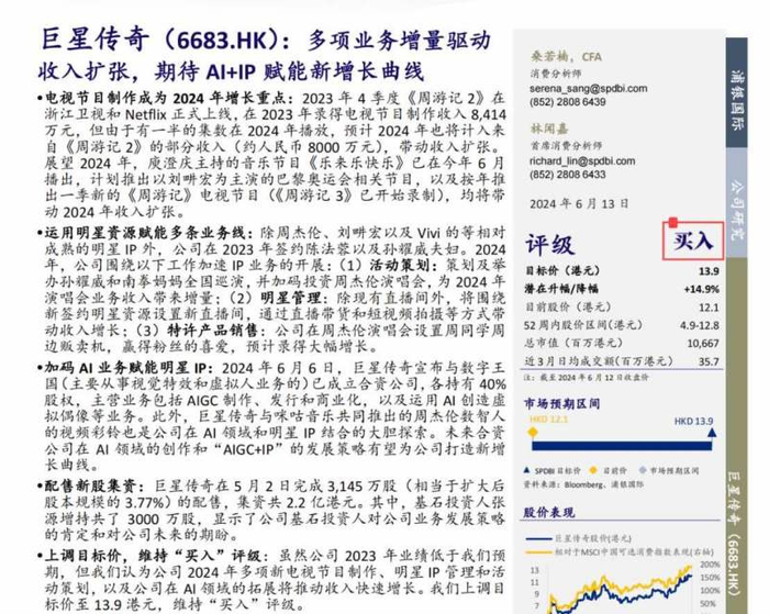 6月13日,浦银国际发布巨星传奇(6683.HK)跟进研究报告,维持“买入”评级,考虑到巨星传奇2024年多项新电视节目制作、明星IP管理和活动策划,以及公司在AI领域的拓展将推动收入快速增长,遂将目标价上调至13.9港元。此前,浦银国际曾在首次覆盖巨星传奇的研报中给出7.8港元的目标价。