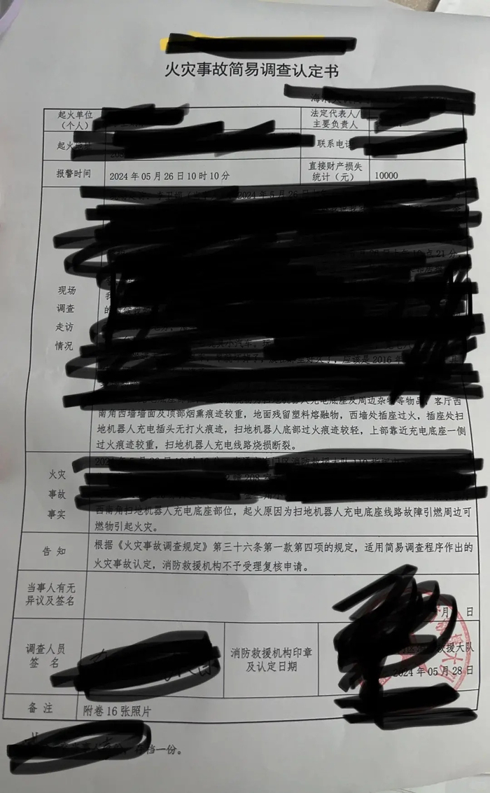 通过张女士晒出的火灾事故简易调查认定书可以看到,火灾事故原因为扫地机器人充电底座线路故障引燃周边可燃物导致,直接经济损失10000元。