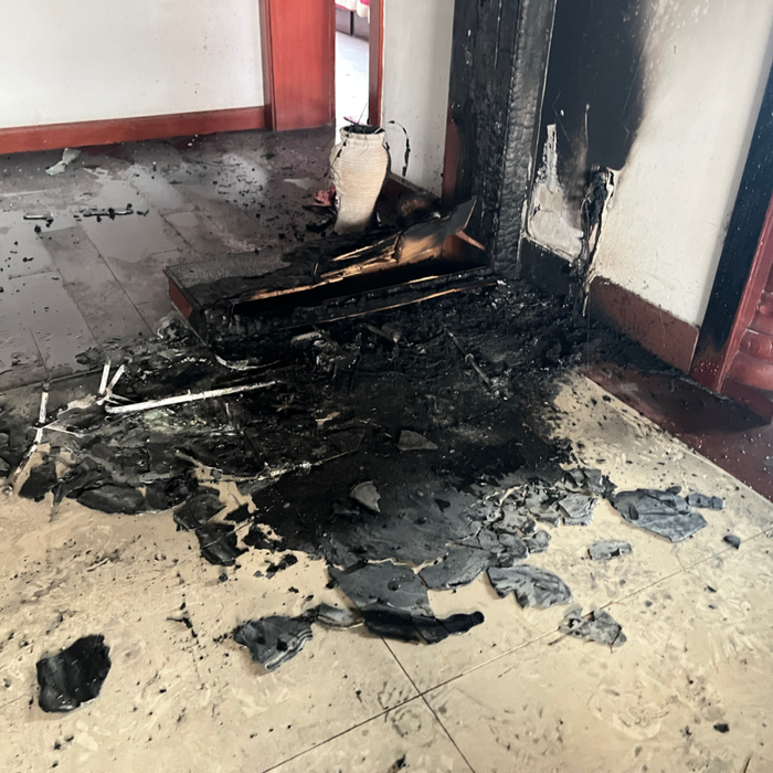 同时张女士向值接Talk展示了发生火灾后的现场照片,可以看到,现场被烧的很严重,包括部分木质框已被烧黑,同时黑烟已经将部分吊顶熏黑。