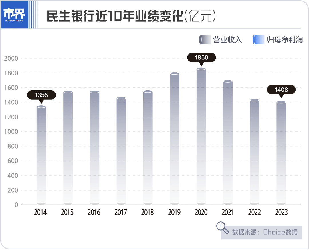 最关键的息差收入直接拉低了该行营收和利润。2023年,民生银行营收为1408.17亿元,不及2015年1544.25亿元的水平;358.23亿元的净利润,也与2015年的461.11亿元相比,少了100多亿。