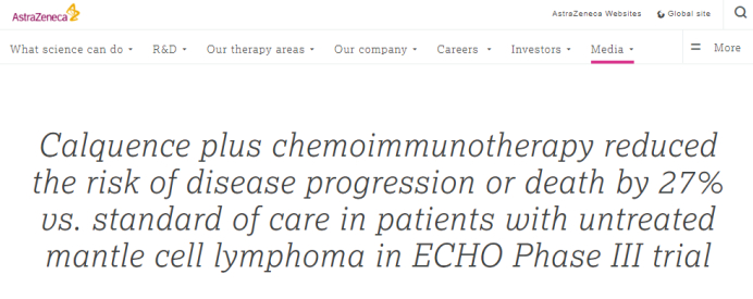 日前,阿斯利康公布了Ⅲ期临床试验ECHO研究的关键结果:与标准治疗相比,Calquence(阿卡替尼)联合化疗和免疫疗法,将未经治疗的套细胞淋巴瘤(MCL)患者的疾病进展或死亡风险降低了27%。