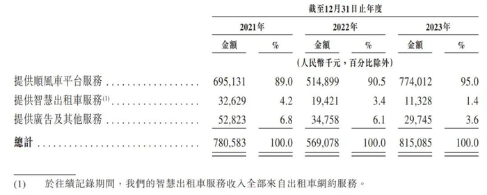 于2021年、2022年及2023年,嘀嗒出行从顺风车平台服务产生的收入分别为6.95亿元、5.15亿元及7.74亿元,分别占同年总收入的89.0%、90.5%及95.0%。