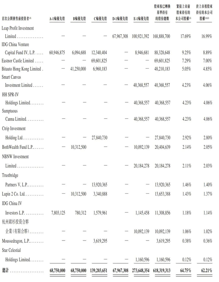 高瓴资本旗下HHSPR-IV持股4.06%,京东旗下Sumptuous持股4.06%,携程持股2.8%,Trustbridge Partners V, L.P.持股为1.4%。Lupin 2持股1.4%,杭州铭杉投资合伙企业持股1.02%,其他公众股东持股为3.93%。