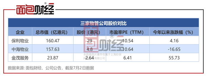 截至7月2日数据,申万港股物业管理板块平均PE(TTM)为8.96。金茂服务PE(TTM)在6.41,低于均值,而保利物业、中海物业PE(TTM)均在10左右。