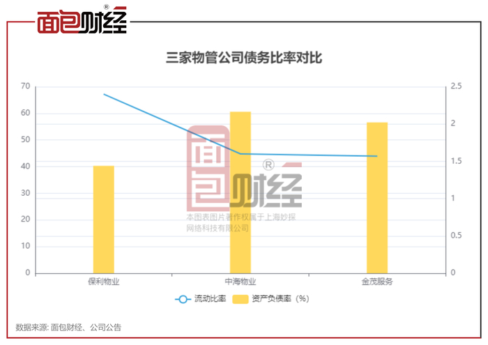员工薪酬上,保利物业薪酬开支同比降低6.94%,中海物业薪酬开支降低较为明显,接近10%,而金茂服务同比仅降低1.52%。在职员工人均薪酬方面,金茂服务较高。财务安全:中海物业资产负债率偏高