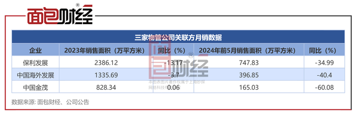 2024年前5月,保利发展销售面积实现747.83万平方米,同比下滑34.99%;中海物业关联方中国海外发展前5月销售面积为396.85万平方米,同比下降40.4%;金茂服务关联方中国金茂前5月销售面积实现165.03万平方米,同比下滑超六成。