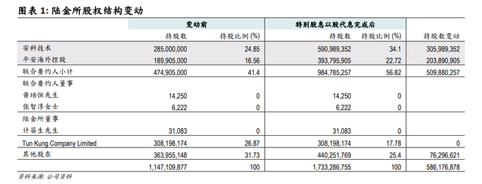 在陆金所派发特别股息之后,中国平安选择以股代息,Tun Kung选择现金股息,部分公众股东选择以股代息,新的股权结构为:平安持股上升至56.82%,Tun Kung持股降至17.78%,公众持股降至25.4%。