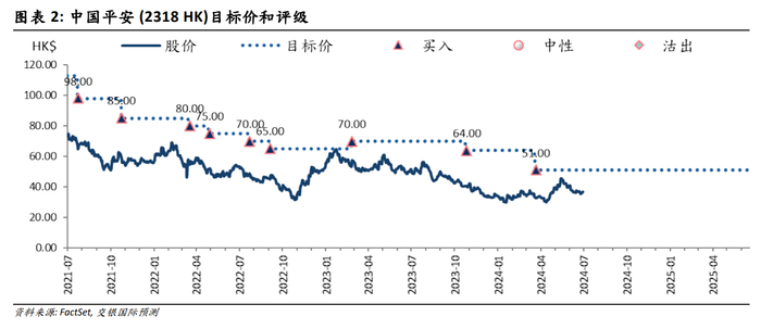 目前中国平安的股价对应2024年市净率0.65倍,股息率超过7%,估值再度回到有吸引力的区间。他们预计公司 2024 年营运利润在去年低位上实现正增长具有较高确定性,维持买入评级和51港元的目标价。