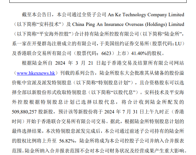 中国平安对陆金所特别股息选择以股代息影响多大?