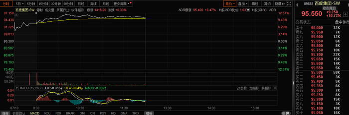港股百度集团-SW(09888.HK)也跳空高开,截至午间收盘涨超10%。