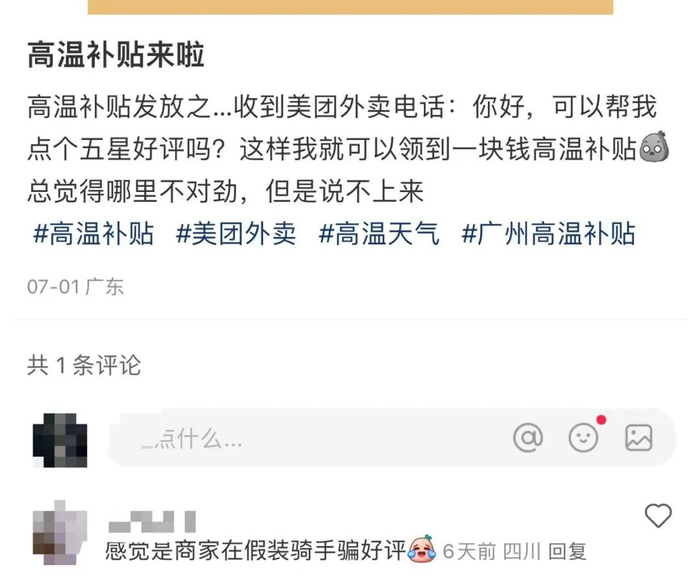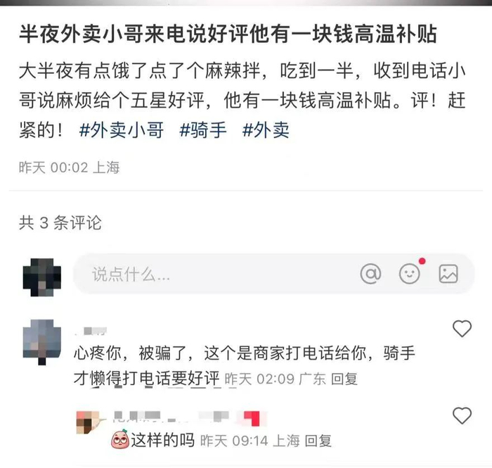 此外,在社交平台上,也有不少网友发帖称遇到过类似以打包员、骑手等名义索要好评的电话或短信。“我是送餐员,请给商家五星好评,这样我可以拿到1元高温补贴”“我是刚才送餐的骑手,还差一个五星好评就达标了,拜托支持一下!”