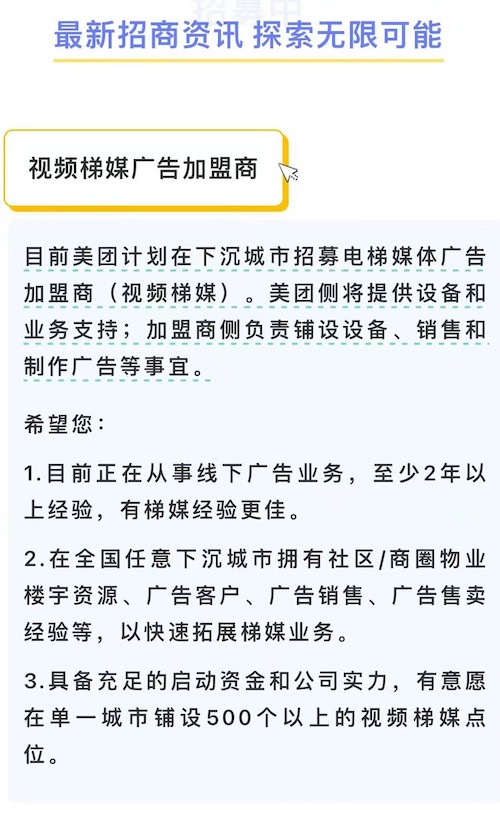 7月11日,“美团外卖合作城市”公众号发文称,计划在下沉城市招募电梯媒体广告加盟商(视频梯媒):美团侧将提供设备和业务支持;加盟商侧负责铺设设备、销售和制作广告等事宜。