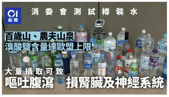 7月15日,香港消委会发布《饮水思源30瓶装水口味、矿物、安全检测》一文,指出农夫山泉饮用天然水、百岁山饮用天然矿泉水两款产品的样本检测出每升含有3微克溴酸盐。