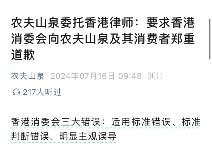 文章发布的次日上午,农夫山泉通过官方微信公众号对其表达强烈不满,称香港消委会有三大错误:适用标准错误、标准判断错误、明显主观误导。