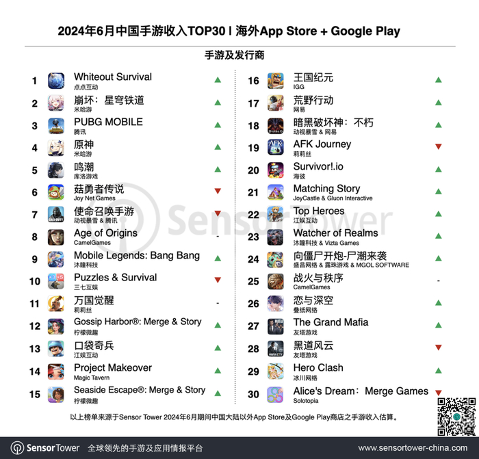 Sensor Tower商店情报平台公布2024年6月中国手游产品在海外市场收入及下载量排行榜。6月28日《鸣潮》1.1版本“往岁乘霄醒惊蛰”正式上线,版本更新和新角色的推出带动《鸣潮》快速迎来收入高峰,6月海外收入环比增长121%,蝉联增长榜冠军,跃居收入榜第5名,排名紧逼《原神》。腾讯王者荣耀海外下载量激增至5月的6.6倍之多,跻身6月下载榜第8名。