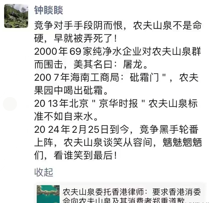 香港消委会暗示农夫山泉或致癌,钟睒睒朋友圈回应:对手阴而狠