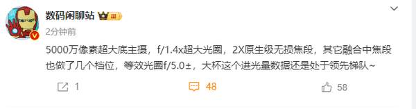 据知名数码博主@数码闲聊站 最新发布的信息显示,与此前曝光的消息基本一致,全新的小米15 Pro将搭载一颗5000万像素的超大底主摄,配备F/1.4x的超大光圈,支持2X原生级无损变焦拍摄。其他融合中焦段也精心设计了多个档位,等效光圈达到f/5.0±。对此该博主表示:大杯的这个进光量足以让小米15 Pro在同类产品中保持领先地位。不仅如此,结合此前相关爆料,该机还将支持可变光圈,可在f/1.4-f/2.5之间调节,配备潜望式长焦镜头,支持3X光学变焦。