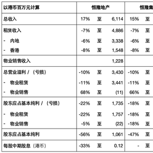 物业销售方面,香港的皓日(The Aperture)、武汉“恒隆府”和位于香港蓝塘道的一间大宅于报告期内合共进账港币12.28亿元的销售收入。