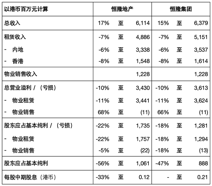 (香港,2024年7月30日)恒隆地产有限公司(香港联交所股份代号:00101)及恒隆集团有限公司(香港联交所股份代号:00010)今天公布截至2024年6月30日止六个月的业绩。恒隆地产及恒隆集团的总收入分别增长17%及15%至港币61.14亿元及港币63.79亿元,其中确认物业销售收入港币12.28亿元。期内,香港及内地受零售及办公楼市场疲弱影响,恒隆地产及恒隆集团的整体租赁收入分别下跌7%至港币48.86亿元及港币51.51亿元。