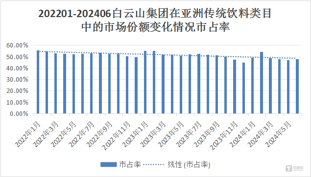 马上赢数据显示,在从2022年至今的市场中,无论是凉茶品类的整体销售额,还是白云山集团在饮料类目中的市场占有率走势,那个曾经风光无限的时代,都在逐渐远去。