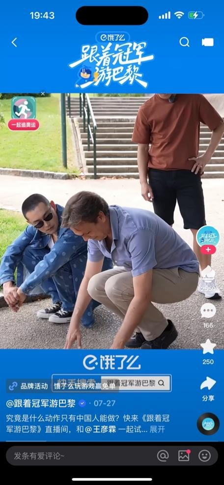 本次奥运会,快手邀请中国短跑运动员、有“中国百米第一人”之称的苏炳添与演员王彦霖一同现身巴黎。由于开幕式当天巴黎下起了雨,苏炳添笑称这场雨给自己的vlog增添了一点抓马感,还调侃起了王彦霖的造型。但没想到的是,王彦霖也因为开幕式淋雨而在录制《跟着冠军游巴黎》的途中因低烧登上了热搜,还被网友们调侃是“巴黎奥运会开幕式受害人”之一。