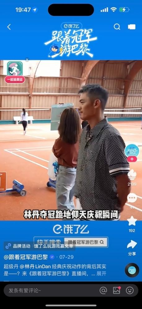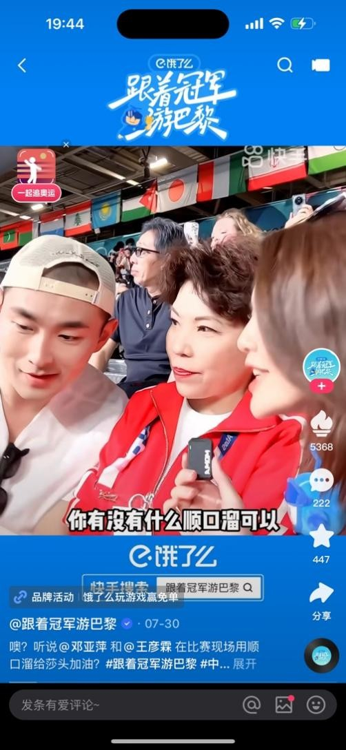 在去年的杭州亚运会上,快手倾情打造的亚运自制节目《冠军观赛团》火热出圈,成功策划了#姚明奥尼尔亚运现场重逢、#苏炳添李晨现身亚运现场等多个全网级热点事件。在2024年巴黎奥运会之际,由饿了么独家冠名播出的冠军前方节目《跟着冠军游巴黎》火热上线,邀请苏炳添、王彦霖、林丹、邓亚萍、魏秋月等大家耳熟能详的奥运冠军、明星、快手达人前往巴黎,带老铁们一起身临其境看奥运,体验浪漫之都的奥运氛围,在巴黎前方为我国运动员加油助威。
