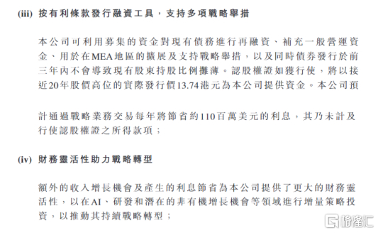 此轮融资方案结合了可换股债券与认股权证,相较于直接股权融资或传统贷款方式,可能展现出更低的融资成本与更高的财务灵活性。具体而言,Alat提供的20亿美元无息可换股债券,期限为三年,到期后可转换为公司股份,其好处主要体现在三个方面:一是直接降低了融资成本,避免了传统债券的利息支出,联想预计每年可因此节省约1.1亿美元(即110百万美元)的利息费用,从而提升盈利能力;二是保留的现金流增强了公司的财务灵活性,使得资金可用于更具价值的投资或运营活动,同时减轻了债务负担,降低了财务风险,为未来融资创造了更有利条件;三是提供了未来股权转换的可能性,为公司与投资者之间的利益绑定提供了新途径。