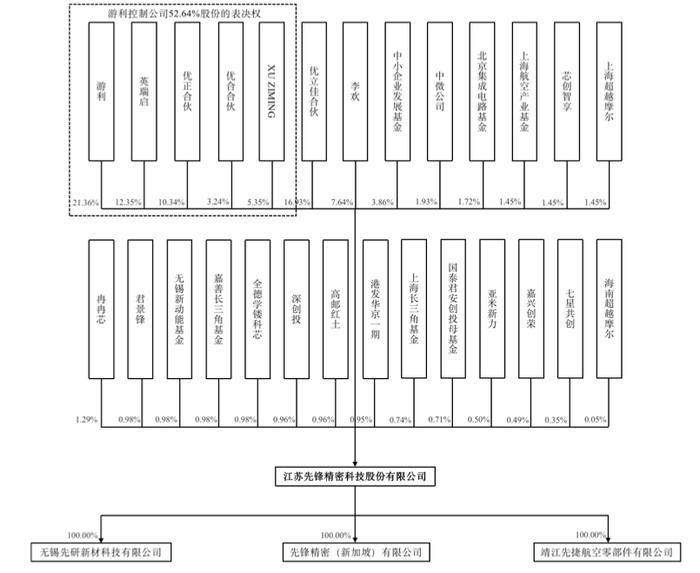 招股书显示,先锋精科董事长游利直接持有公司21.36%股份,其配偶褚潋通过英瑞启持股12.35%,表决权由游利控制。最终,游利合计控制公司52.64%股份的表决权。