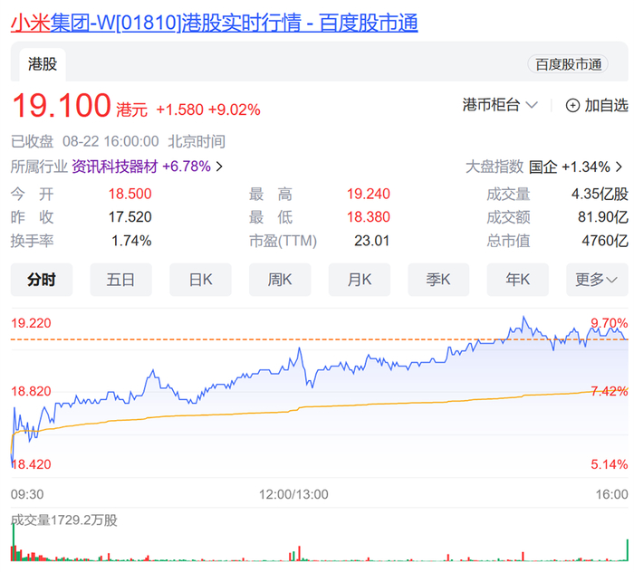 ▲小米汽车毛利率对比也就是说,小米汽车目前的毛利率已经实现了转正,转亏为盈也并非不可能。此外,雷军还回应了小米股价大涨,感谢投资者支持,雷军表示:“谢谢我们所有股东的支持,这个股票涨了,祝大家开心,跌了也别骂我......我保证我努力工作,让大家都挣点钱。”目前,小米港股股价报19港元/股(约合人民币17元/股),飙涨9%,市值为4760亿港元(约合人民币4357亿),暴涨394亿港元(约合人民币360亿)。