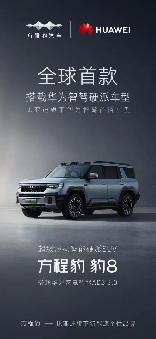 此次比亚迪与华为的智驾合作,将全面落地于旗下子品牌方程豹,豹8则将成为比亚迪旗下华为乾崑智驾首搭车型,同时也是全球首款搭载华为智驾的硬派车型。比亚迪与华为双方将携手赋能方程豹品牌,一同打造全球首个硬派专属智驾方案,开启全球智能硬派新时代。据悉,双方团队已立项并研发验证了很长时间,预计于今年的Q3以后,豹8就将搭载华为乾崑智驾ADS3.0正式上市。