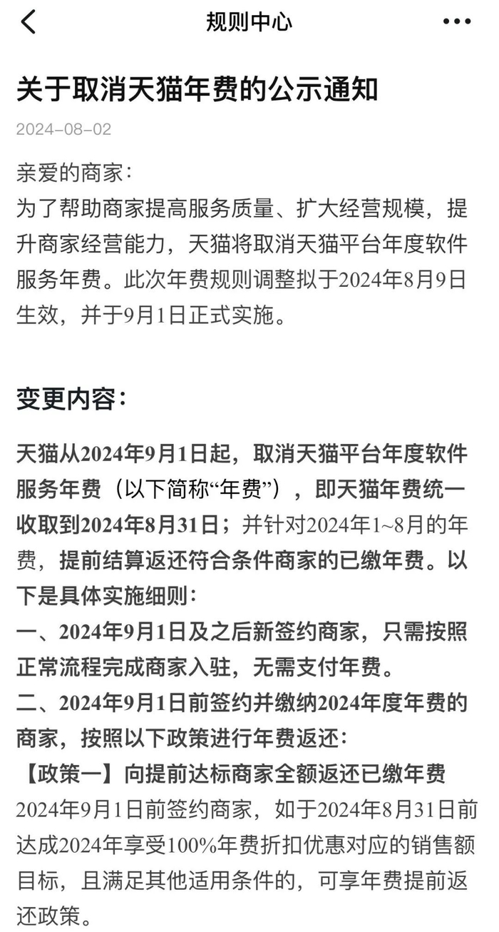 7月底,淘宝天猫宣布取消年度软件服务年费,自2024年9月1日起实施。新入驻商家将无需再支付这笔费用,而达成全年经营目标的商家则可享受年费提前返还的优惠,其余商家也将获得部分年费的返还。
