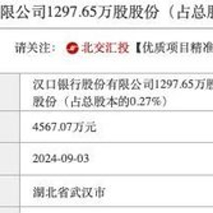湖北通信所持1297.65万股汉口银行股份为原始股,占汉口银行总股本的0.27%,此次挂牌转让时间为9月3日至9月30日。