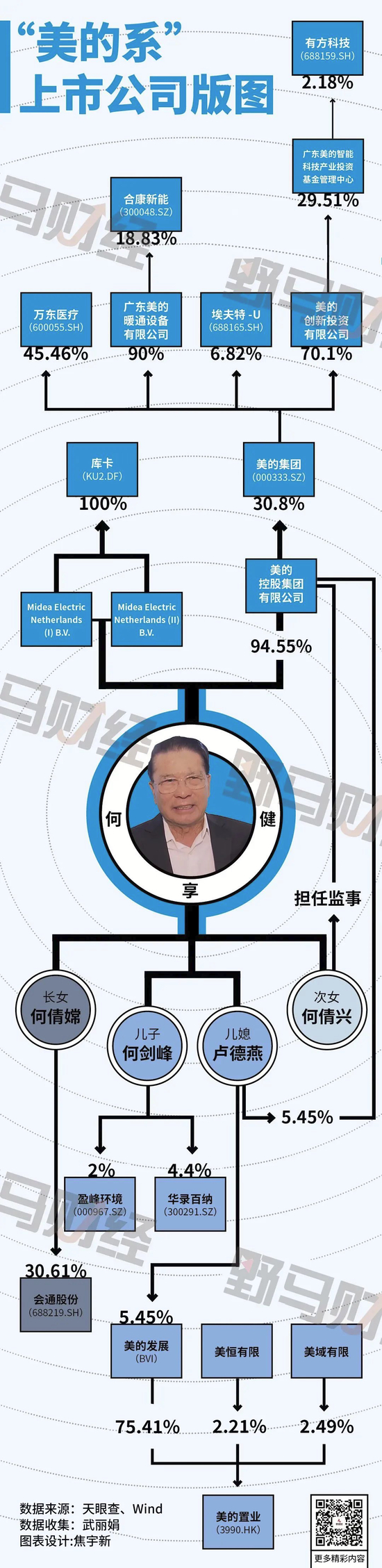而何家的“三个女人”也是“巾帼不让须眉”,其中,何享健儿媳卢德燕与何享健共同执掌美的集团大股东美的控股。何享健持有美的控股94.55%股份,卢德燕持有5.45%。据此计算,卢德燕间接持有美的集团1.7%股份,市值104.28亿元。